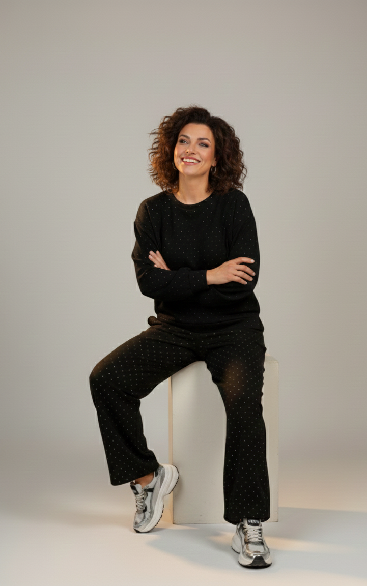 Ervaar het ultieme comfort zonder in te leveren op stijl met de "Stardust" Lounge Set. Deze tweedelige set, bestaande uit een oversized trui met lange mouwen en een bijpassende, wijdvallende broek, is uitgevoerd in een diep zwarte/witte/beige stof met een subtiel, all-over stippenpatroon dat doet denken aan een sterrenhemel.